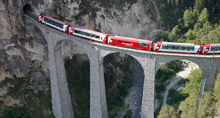 En av de vakreste togturene i Europa. Bernina Express tar deg med på en to timers reise mellom Tirano i Italia og St. Moritz i Sveits. Denne spektakulære reisen bringer deg gjennom UNESCOs verdensarvbeskyttede Bernina-pass, over 196 broer og gjennom 55 tunneler. Underveis kan du beundre den fantastiske utsikten over de sveitsiske og italienske alpene, med snødekte topper, frodige daler og vakre gamle byer og landsbyer. Og uansett årstid er det alltid noe å se – blomster om våren, frodig grønn vegetasjon om sommeren, strålende farger om høsten og snødekte landskap om vinteren.
