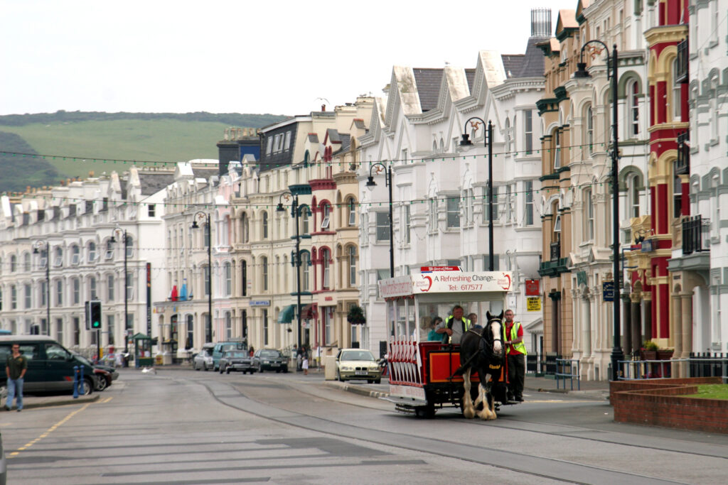 Langs promenaden i Douglas går fortsatt hestetrukne trikker, som et levende minne fra viktoriatiden.