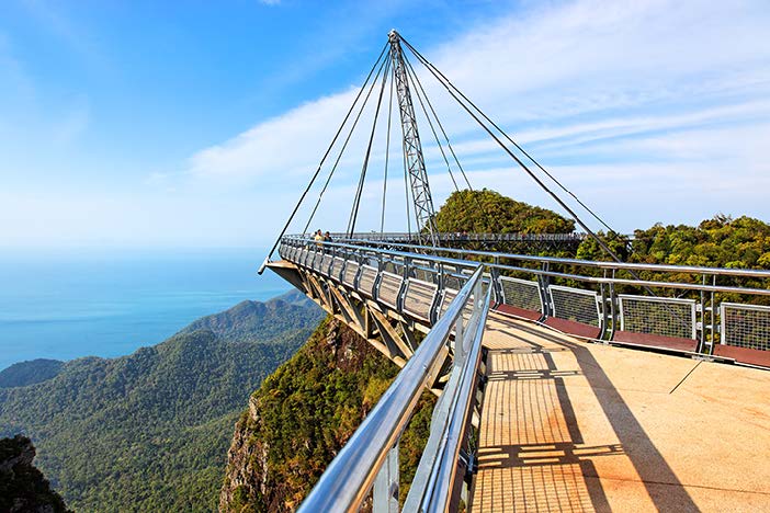 En av de mest spektakulære opplevelsene er turen opp Gunung Mat Cincang. Med Langkawi SkyCab – en av verdens bratteste taubaner – løftes du over tett regnskog, der eldgamle trær dekker fjellsidene under deg. På toppen venter Sky Bridge, en dramatisk gangbro som svever over jungelen og gir panoramautsikt så langt øyet rekker. Det er øyeblikk som dette som minner deg på hvorfor du reiser.
